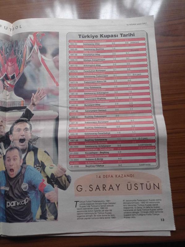 Cumhuriyet Spor Gazetesi - 10 Nisan 2007 - Türkiye Kupası Tarihi - Galatasaray 14 Defa Türkiye Kupasını Kazandı - Alpella Tad Veriyor - Ulusal Yıldız Kız Ve Erkek Takımlarımız -Tuncay Şanlı ve Ersen Martin Fotoğrafı - Bul Kupayı Al Parayı - Gökhan Ünal - Delgado - Dopinge Büyük Gözaltı - Ralli'nin Dinç Pilotu adlı eser Türkçe dilindedir.