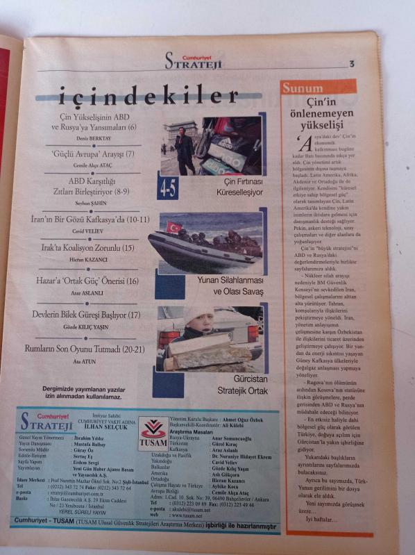 Cumhuriyet Strateji Gazetesi- 13 Şubat 2006 - Sayı 85 - Çin'in Önlemeyen Yükselişi - Güçlü Avrupa Arayışı - Irak'ta Koalisyon Zorunlu - Hazar'a Ortak Güç Önerisi - Yunan Silahlanması Ve Olası Savaş adlı eser Türkçe dilindedir.