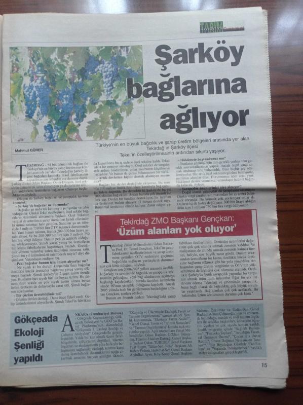 Cumhuriyet Tarım Hayvancılık Gazetesi - 13 Eylül 2005 - Sayı 13 - Şarap Deyimleri - Kalecik Bağcılıkla Şenleniyor - Turasan Üç Kuşaktır Nevşehir'de Bağcılık Yapıyor - Bozcaada'ya Ekolojik Fidan -Bağcılık Ve Şarapçılık ÖTV İle Vuruldu - Uzmanından Şarap Tatmanın Gizleri - Günde Bir Kadeh Şarap Sağlığa Yararlı - Diren'in Yeni Etiketleri Santrançtan adlı eser Türkçe dilindedir.