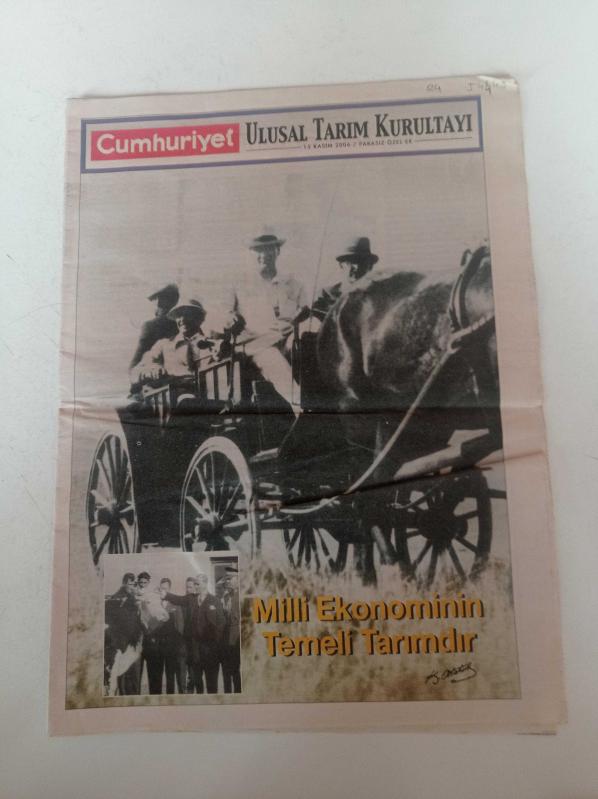 Sayfa Boyutu: 28*38cm Sayfa Sayısı:24 Cumhuriyet Ulusal Tarım Kurultayı Gazetesi Yıpranma, sararmalar, kupon kesiği ve yırtılmalar zamana bağlı olarak görülebilir