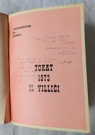 Eser İl Yıllığı Hazırlama Komitesi editörlüğünde hazırlanmıştır. Kitap 1973 yılında Tokat tarafından [Ankara] yayınlanmıştır. 446 sayfadır. Cumhuriyetin 50. Yılında Tokat 1973 İl Yıllığı [İMZALI] / 60 - Tokat adlı eser Türkçe dilindedir.
