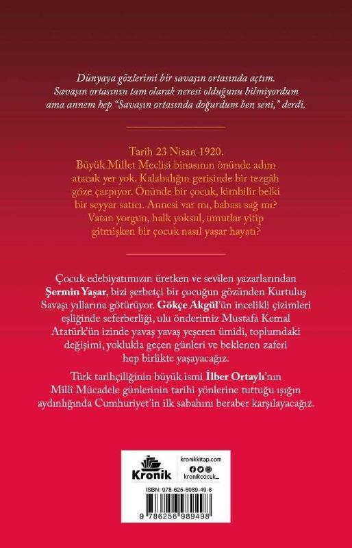 Dünyaya gözlerimi bir savaşın ortasında açtım. Savaşın ortasının tam olarak neresi olduğunu bilmiyordum ama annem hep “Savaşın ortasında doğurdum ben seni,” derdi. Tarih 23 Nisan 1920. Büyük Millet Meclisi binasının önünde adım atacak yer yok. Kalabalığın gerisinde bir tezgâh göze çarpıyor. Önünde bir çocuk, kimbilir belki bir seyyar satıcı. Annesi var mı, babası sağ mı? Vatan yorgun, halk yoksul, umutlar yitip gitmişken bir çocuk nasıl yaşar hayatı? Çocuk edebiyatımızın üretken ve sevilen yazarlarından Şermin Yaşar, bizi şerbetçi bir çocuğun gözünden Kurtuluş Savaşı yıllarına götürüyor. Gökçe Akgül’ün incelikli çizimleri eşliğinde seferberliği, ulu önderimiz Mustafa Kemal Atatürk’ün izinde yavaş yavaş yeşeren ümidi, toplumdaki değişimi, yoklukla geçen günleri ve beklenen zaferi hep birlikte yaşayacağız. Türk tarihçiliğinin büyük ismi İlber Ortaylı’nın Millî Mücadele günlerinin tarihi yönlerine tuttuğu ışığın aydınlığında Cumhuriyet’in ilk sabahını beraber karşılayacağız. (Tanıtım Bülteninden)