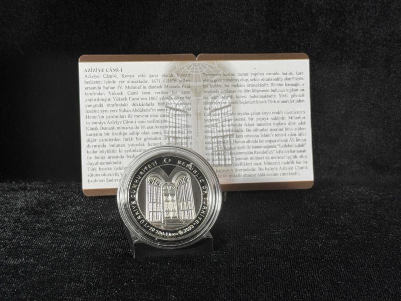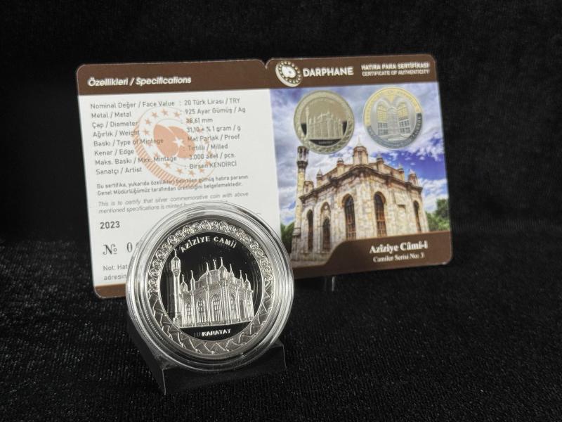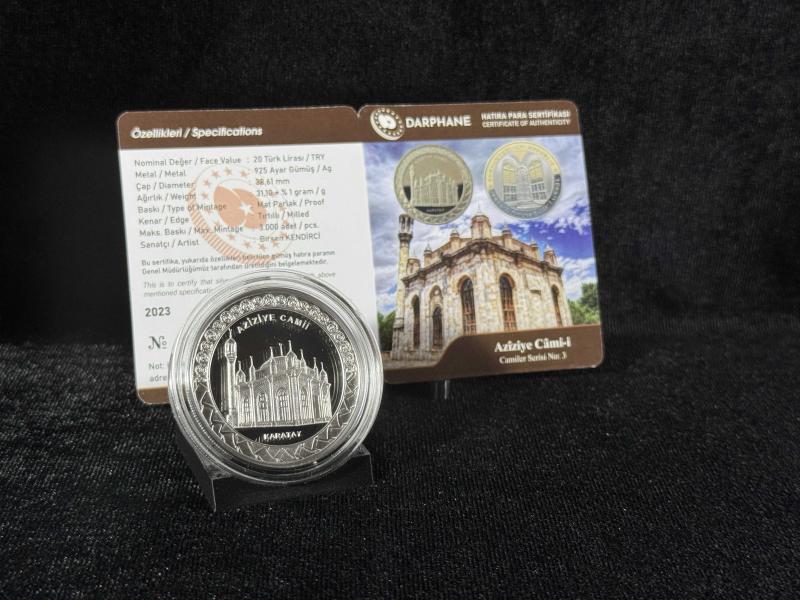 DARPHANE Azîziye Câmi-i Camiler Serisi No:3 el değmemiş kapsül içerisinde **Azîziye Câmi-i Camiler Serisi No:3 Gümüş Hatıra Para - Sanat, Tarih ve İnancın Zarif Buluşması!** Tarihi ve estetik değeri yüksek olan Azîziye Câmi-i, Osmanlı mimarisinin en zarif örneklerinden biridir. Türkiye Cumhuriyeti Darphanesi tarafından sınırlı sayıda üretilen bu hatıra para, "Camiler Serisi"nin üçüncü numarası olarak koleksiyonerlere sunulmaktadır. 925 ayar saf gümüşten üretilen bu eşsiz para, özenli işçiliğiyle dikkat çekerken; Azîziye Camii'nin ince detaylarını ve mimari güzelliklerini titizlikle yansıtır. Bu özel para, koleksiyonuna değer katmak isteyenler ve tarihi cami mirasını simgeleyen nadide bir parça arayanlar için ideal bir seçenektir. Azîziye Camii'nin görkemini ve kültürel zenginliğini yansıtan bu hatıra para, zarif sunum kutusuyla birlikte teslim edilmekte olup, anlamlı bir hediye seçeneği olarak da öne çıkmaktadır. **Sınırlı Stok!** Sadece belirli sayıda üretilen Azîziye Câmi-i Gümüş Hatıra Para, tarih ve sanat severler için koleksiyonlarına değer katacak bir başyapıt. Ürün Özellikleri Metal: 925 AYAR GÜMÜŞ Kenar: TIRTILLI Çap: 38,61 MM Baskı: PROOF / RENKLI Maksimum Baskı Adedi: 3000 Nominal Değer: 20 TÜRK LIRASI