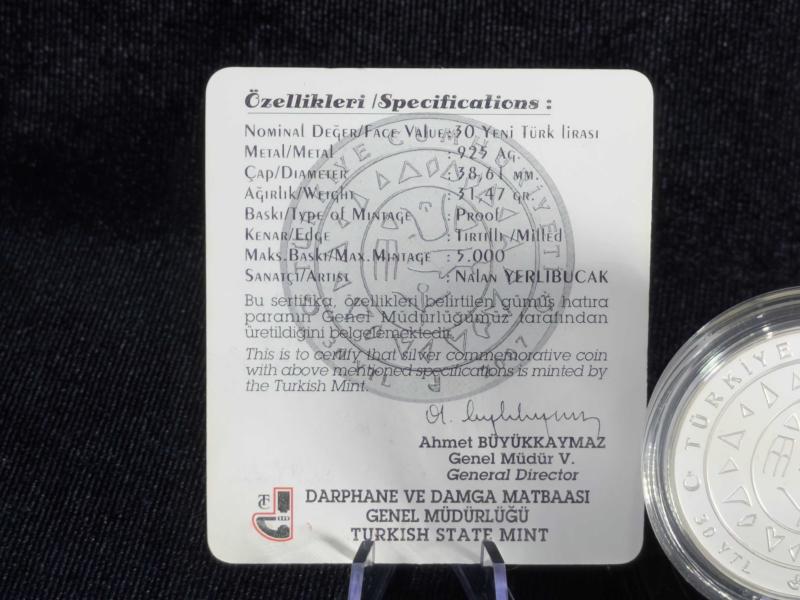 DARPHANE TRUVA – Antik Kentler Serisi No:3 Gümüş Hatıra Sikke Gümüş Hatıra Sikke | Çil – Kapsül İçinde – Sertifikalı Çil – Kapsül İçinde – Sertifikalı** Antik çağın en gizemli ve en çok anlatılan kentlerinden biri olan Truva, Antik Kentler Serisi’nin üçüncü sikkesi olarak bu özel çalışmada ölümsüzleştirilmiştir. Mitoloji, tarih ve arkeolojinin kesişim noktasında yer alan Truva teması; bu gümüş sikkeyi yalnızca bir koleksiyon parçası değil, aynı zamanda kültürel hafızayı temsil eden sanatsal bir eser hâline getirmektedir. Sikkenin ön yüzünde, Truva ile özdeşleşmiş Truva Atı figürü merkezde yer almakta; etrafında antik dönemi simgeleyen savaşçı betimleri dikkat çekmektedir. Figürlerin kabartma derinliği, dönemin destansı anlatımını güçlü biçimde yansıtırken; kompozisyon, hareket ve denge açısından son derece başarılı bir bütünlük sunmaktadır. Üst bölümde yer alan “İnsanoğlunun Kültür Mirası” vurgusu, Truva’nın evrensel tarih içindeki yerini simgesel olarak pekiştirir. Arka yüzde ise Türkiye Cumhuriyeti ibaresi, nominal değer ve Orta Asya kökenli geometrik semboller ile çevrelenmiş dairesel bir düzenleme bulunmaktadır. Bu tasarım, Anadolu uygarlıkları ile Türk kültürünün tarihsel sürekliliğine ince bir gönderme niteliği taşır. Proof baskı tekniği, mat ve parlak yüzey geçişleri sayesinde detayları net, yüzeyi ise yüksek estetik kalitede sunar. 925 ayar gümüşten üretilmiş olan sikke, 38,61 mm çapı ve tırtıllı kenar yapısı ile klasik koleksiyon standartlarını taşımaktadır. Çil kondisyonda, orijinal kapsülü içerisinde ve sertifikasıyla birlikte muhafaza edilmektedir. Sergileme ve uzun süreli koleksiyon saklaması için son derece uygundur. Sertifikada belirtilen nominal ağırlık 31,47 gram olup, bu değer antik kentler temalı gümüş sikkelerde tercih edilen dengeli ve koleksiyon standartlarına uygun bir ölçüdür. Truva gibi mitoloji ve tarih literatüründe eşsiz bir yere sahip bir antik kentin bu seride yer alması; eseri arkeoloji, mitoloji ve antik dünya temalı koleksiyonlar için özel ve prestijli bir noktaya taşımaktadır. ⸻ Teknik Özellikler • Metal: 925 Ayar Gümüş • Ağırlık: 31,47 g • Çap: 38,61 mm • Kenar: Tırtıllı • Baskı Türü: Proof • Nominal Değer: 30 Yeni Türk Lirası • Sanatçı: Nalan Yerlibucak • Tedavül Yılı: 2007 • Kondisyon: Çil • Muhafaza: Orijinal kapsül ve sertifika ⸻ Mitolojik anlatımı, güçlü kabartma sanatı ve Antik Kentler Serisi içindeki konumuyla TRUVA Gümüş Sikke; tarih, arkeoloji ve kültürel miras odaklı koleksiyonlar için anlamı yüksek, estetik değeri güçlü ve zamansız bir eserdir.