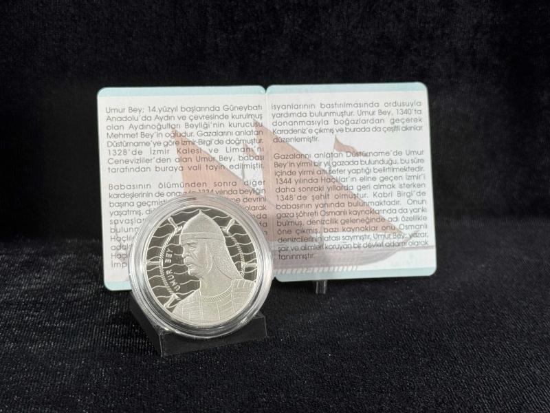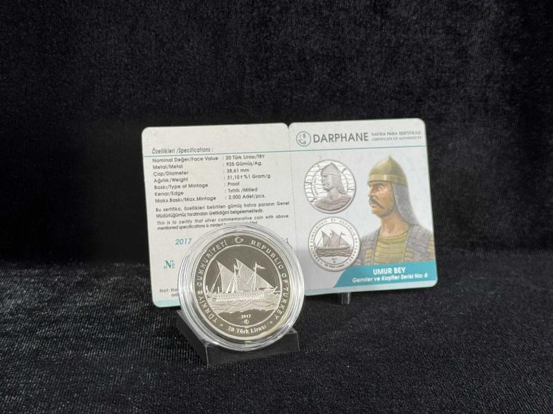 DARPHANE UMUR BEY 2017 - GEMİLER VE KAŞİFLER SERİSİ No. 8 Bu koleksiyon parçası, Türkiye Cumhuriyeti Darphanesi tarafından 2017 yılında çıkarılan Gemiler ve Kaşifler Serisi'nin bir parçasıdır ve No. 8: Umur Bey gümüş hatıra parası olarak bilinir. Özenle tasarlanmış bu 925 ayar gümüş para, Ege’nin güçlü denizcisi ve Osmanlı'nın ilk büyük deniz komutanlarından biri olan Umur Bey’in denizcilikteki başarılarını ve mirasını onurlandırır. Ön yüzünde Umur Bey’in cesur ve liderlik dolu tasviri, detaylı bir şekilde işlenmiş olup, arka yüzünde Osmanlı dönemi denizcilik ruhunu yansıtan semboller ve döneme ait bir gemi figürü yer alır. Sınırlı sayıda üretilmiş olan bu koleksiyon parçası, hem tarih meraklıları hem de koleksiyoncular için benzersiz bir eser sunar. HATIRA GÜMÜŞ PARA SERTİFİKALI Kapsül içerisinde el değmemiş Ürün Özellikleri Metal : 925 Ayar Gümüş Çap : 38.61 mm Ağırlık : 31.10 gram Baskı : Proof Kenar : Tırtıllı Bu eşsiz hatıra parası, Atatürk’ün ilke ve inkılaplarına olan bağlılığınızı simgeleyecek, koleksiyonunuza derin bir anlam katacaktır. Hem Türk tarihine hem de estetiğe değer veren koleksiyoncular için kaçırılmayacak bir fırsat.