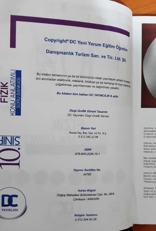 Kitap 2018 yılında DC YAYINLARI tarafından yayınlanmıştır. 232 sayfadır. DC YAYINLARI, 10. SINIF FİZİK KONU ANLATIMLI SORU BANKASI adlı eser Türkçe dilindedir.