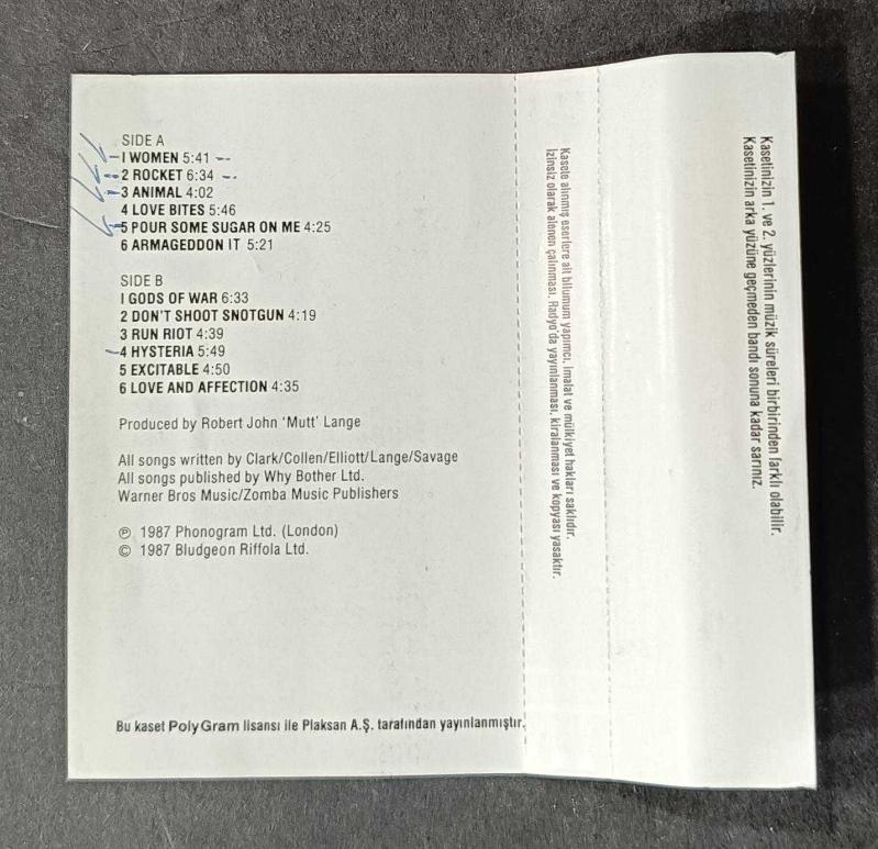 ROCK 1987 BASKI MERCURY / YONCA MÜZİK ESERLER: A1 Women A2 Rocket A3 Animal A4 Love Bites A5 Pour Some Sugar On Me A6 Armageddon It B1 Gods Of War B2 Don't Shoot Shotgun B3 Run Riot B4 Hysteria B5 Excitable B6 Love And Affection 2.EL, TEMİZ ORİJİNAL VE BANDROLLÜ KARTONET İÇİNDEKİ İLK ŞARKILARIN ÖNÜNE TIK ATILMIŞ KASET BAŞTAN SONA DİNLENİP, KONTROL EDİLMİŞTİR GÖRSELDEKİ ÜRÜN