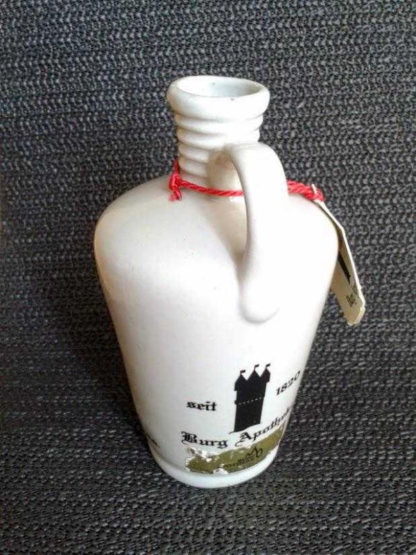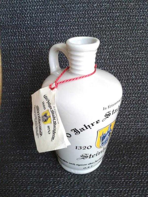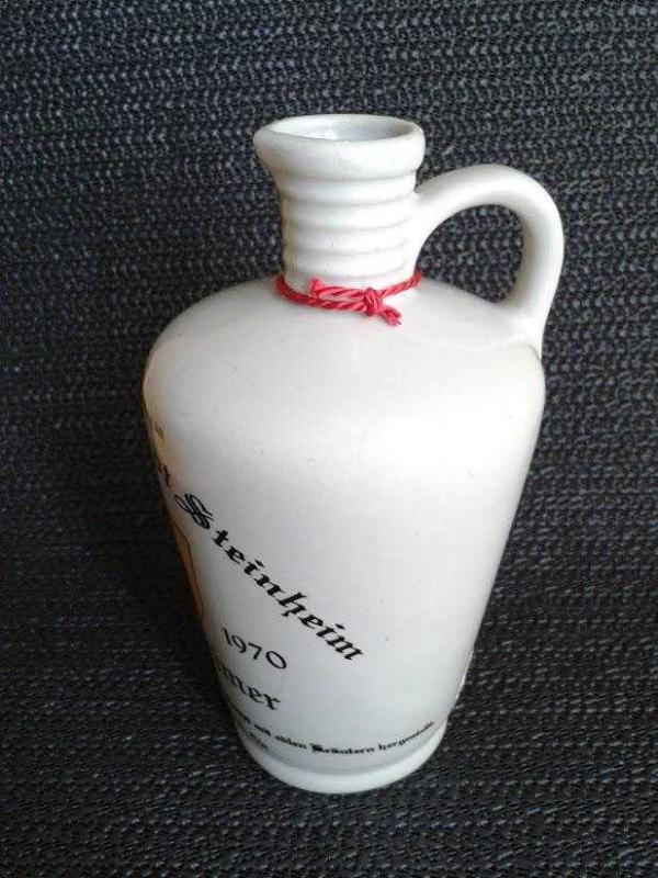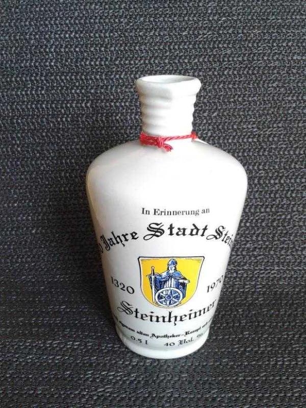 DEKORLUK, KOLEKSİYONLUK, PORSELEN ŞİŞE Steinheim şehrinin eczanelerinde zamanında ilaç için kullanıldığı , sonradan Likör için kullanılmaya başlanan 650 yılık geleneksel Porselen Şişe. İsteğe göre dekorasyon amaçlı yada kullanıma uygundur. Üretim 1970 Dönem ürünüdür..Mezat ürünüdür. Hiç Kullanılmamış. Hasarsız tertemiz üzerinde en ufak atığı olmayan bir ürün.. Çekimden kaynaklı renk farkı oluşmaktadır.
