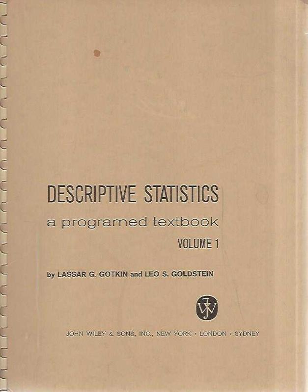 DESCRIPTIVE STATISTICS A PROGRAMED TEXTBOOK VOLUME 1, LASSAR G. GOTKIN - LEO S. GOLDSTEIN tarafından kaleme alınmıştır. Kitap 1967 yılında JOHN WILEY & SONS INC. tarafından [LONDON] yayınlanmıştır. 255 sayfadır. DESCRIPTIVE STATISTICS A PROGRAMED TEXTBOOK VOLUME 1 adlı eser İngilizce dilindedir.