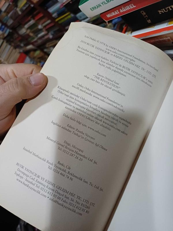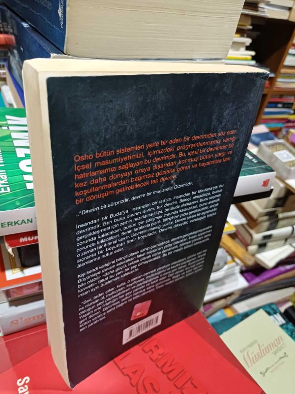 Osho bütün sistemleri yerle bir eden bir devrimden söz eder. içsel masumiyetimizi, içimizdeki programlanmamış varlığı hatırlamamızı sağlayan bu devrimdir. Bu, içsel bir devrimdir: bir kez daha dünyayı oraya dışarıdan konmuş bütün yargı ve koşullanmalardan bağımsız gözlerle gören ve hayatımıza tam bir dönüşüm getirebilecek tek devrim. .."Devrim bir sürprizdir, devrim bir mucizedir. Gizemlidir. İnsandan bir Buda'ya, insandan bir İsa'ya, insandan bir Mevlana'ya; bu devrimdir. Ben buna devrim derim, tek devrim. Bilinçli olmadıkça, bunun gerçekleşmesi için zemin hazırlamadıkça, bir Buda olamazsın. Bunu seçmek zorunda kalacaksın, bunun için çalışmak zorunda kalacaksın, bunu aramak zorunda kalacaksın. Senin tarafında planlı, bilinçli bir çaba gerekecektir, ancak o zaman bir ihtimal vardır. Devrimin mantığı yoktur. Devrim şiirsel bir sıçramadır; sıçrama bir boyuttan öbür boyutadır. Devrim dikeydir; varoluşun başka âlemlerine nüfuz eder. Kişi kendi varlığına bilinçli olarak sahip çıkmadıkça, devrim gerçekleşmeyecektir. Büyümeye devam edeceksin fakat büyümen yatay olacaktır. İnsan süpermen bile olabilir-daha güçlü, teknik olarak daha donanımlı, bilimsel yönden daha kuvvetli- fakat bu yeni bir şey olmayacaktır. Bu bir mesih bilinci olmayacak, insan aynı düzlemde kalacaktır. .."Sev, tadını çıkar, kutla, o zaman cenneti yaratıyor olacaksın; çünkü sen her ne olursan ol, mutluysan, keyifliysen, mutluluğunu ve keyfini paylaşırsın. Ancak olduğun şeyi paylaşabilirsin ve paylaştığında, o sana geri döner. Kural budur. Yaşam ona fırlattığın her şeyi yansıtır ve taklit eder: Geri döner; bin katı olarak geri döner. Gülümse; bütün varoluş sana gülümser. Bağır ve kötü davran; bütün varoluş sana bağırır ve kötü davranır. Esas neden sensin; bütün süreci sen yaratırsın.