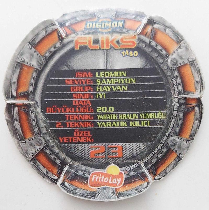 DIGIMON FLİKS 23 LEOMON ORİJİNAL CİPS TASOSU 1DD2G1 NADİR başlıklı antika/koleksiyon objesi Türkiye menşe’lidir. 1950-1999 arası dönemine aittir.