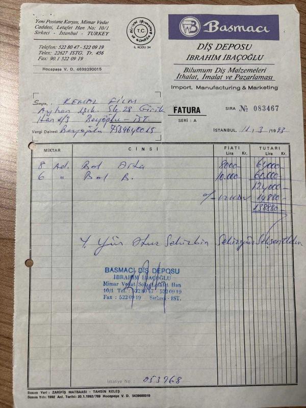 DİŞ MALZEMELERİ FATURASI - 11 MART 1993 - BASMACI DİŞ DEPOSU - İBRAHİM İBAÇOĞLU - BİLİMUM DİŞ MALZEMELERİ - SİRKECİ, İSTANBUL, ANTETLİ - KEMAL FİLM, MEHMET KEMAL SEDEN - BEYOĞLU, İSTANBUL - ISLAK İMZALI, KAŞELİ - 21 x 29 cm EBATLI ORİJİNAL FATURA,TÜRK SİNEMA - FİLM TARİHİ, en son 1 yıl önce güncellenmiştir.