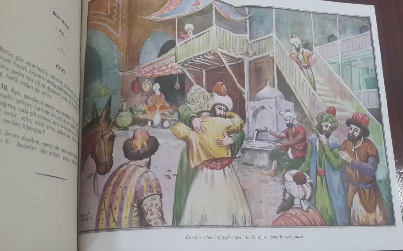 zaman sarısı, şömiz kılıf uçlarında sürtünme aşınması, sayfa cildi-kapak çok iyi korunmuş Divan-ı Kebir'in metni, Konya Müzesinde bulunan Divan'ın, tıpkı basım çevirisidir *CİLT 1 : 3612 beyit, 472 sayfa, 1957 ... *CİLT 2 : 4052 beyit, 512 sayfa, 1958 .. *CİLT 3 : 4526 beyit, 510 sayfa, 1959 ... *CİLT 4 : 4180 beyit, 462 sayfa, 1959 .. *CİLT 5 : 6689 beyit, 524 sayfa, 1960 Mevlâna’nın en bilinen eserleri, hikâye ve öğütlerden oluşan Mesnevî ile gazel ve rubailerden oluşan, ilahî aşk şiirlerini toplayan, Dîvân-ı Kebîr’dir. “Mevlana” adını kullanmadığı divanına, “Dîvan-ı Şems-i Tebrîzî” denmiştir. “Tebrizli Şems bana, İskender gibi, taç, taht, saltanat verdi de, ben, mana ordusunun başkumandanı oldum.” demiştir.(Dîvan-ı Kebîr) Dîvân-ı Kebîr’in Türkçe'deki ilk tam çevirisi, Abdülbaki Gölpınarlı tarafından, 1957-1974 arasında yapılarak; ilk 5 cildi aynı,6. ve 7. ciltleri farklı farklı olmak üzere,3 ayrı yayınevinden yayınlanmıştır. "Mevlananın Şemsle Buluşması"- Ahmet Çalışel /ressam
