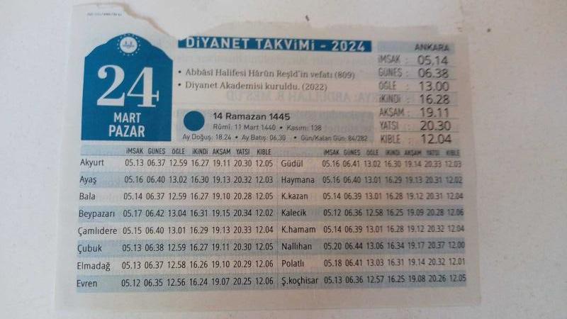 DİYANET TAKVİMi 24 MART 2024 (ANKARA İÇİN) başlıklı ürün, Efemera, Müzik, Sinema > Belge ve Evraklar > Türkçe Belgeler kategorisi altında İkinci El olarak satılmaktadır.