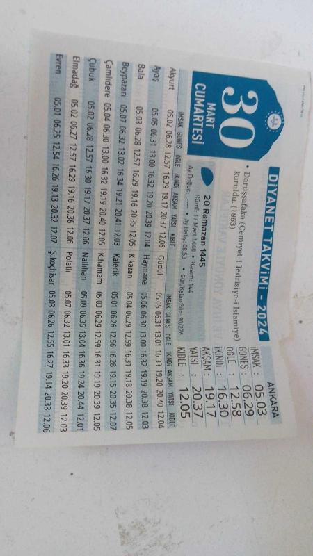 DİYANET TAKVİMi 30 MART 2024 (ANKARA İÇİN) başlıklı ürün, Efemera, Müzik, Sinema > Belge ve Evraklar > Türkçe Belgeler kategorisi altında İkinci El olarak satılmaktadır.