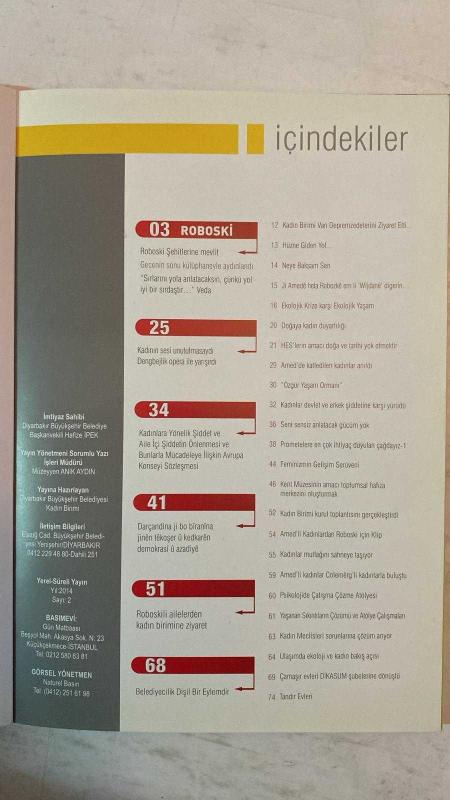 DİYARBAKIR BÜYÜKŞEHİR BELEDİYESİ, KADIN BİRİMİ BÜLTENİ DERGİSİ - 2014 YIL: 1 SAYI: 2 HAFİZE İPEK - MÜZEYYEN ANIK AYDIN - KENAN KOCA - YUSUF ÖZKIR - NEZAHATTİN ÜNLÜ - BİROL KAVDIR - YUSUF GÖR - KEMAL KAHRAMAN - SEYFETTİN ÜNLÜ - CELİL GÜNGÖR - PROF. DR. İLBER ORTAYLI ROBOSKİ ŞEHİTLERİNE MEVLİT - KADININ SESİ UNUTULMASAYDI DENGBEJLİK OPERA İLE YARIŞIRDI - AVRUPA KONSEYİ SÖZLEŞMESİ KADINA YÖNELİK ŞİDDETİN ÖNLENMESİ - ROBOSKİLİ AİLELERDEN KADIN BİRİMİNE ZİYARET - BELEDİYECİLİK DİŞİL BİR EYLEMDİR - VAN DEPREMZEDELERİNE ZİYARET - HÜZNE GİDEN YOL - NEYE BAKSAM SEN - Jİ AMEDÊ HETA ROBOSKÊ EM LI WIJDANE DIGERIN - EKOLOJİK KRİZE KARŞI EKOLOJİK YAŞAM - DOĞAYA KADIN DUYARLILIĞI - HES’LERİN AMACI DOĞA VE TARİHİ YOK ETMEKTİR - AMED’DE KATLEDİLEN KADINLAR ANILDI - ÖZGÜR YAŞAM ORMANI - KADINLAR DEVLET VE ERKEK ŞİDDETİNE KARŞI YÜRÜDÜ - PROMETELERE EN ÇOK İHTİYAÇ DUYULAN ÇAĞDAYIZ - FEMİNİZMİN GELİŞİM SERÜVENİ - KENT MÜZESİ TOPLUMSAL HAFIZA MERKEZİ - KADIN BİRİMİ KURUL TOPLA - TAM TAKIM EKSİKSİZ 82 SAYFA, HAFİZE İPEK tarafından kaleme alınmıştır. Eser MÜZEYYEN ANIK AYDIN editörlüğünde hazırlanmıştır. Kitap . tarafından yayınlanmıştır. 82 sayfadır. DİYARBAKIR BÜYÜKŞEHİR BELEDİYESİ, KADIN BİRİMİ BÜLTENİ DERGİSİ - 2014 YIL: 1 SAYI: 2 HAFİZE İPEK - MÜZEYYEN ANIK AYDIN - KENAN KOCA - YUSUF ÖZKIR - NEZAHATTİN ÜNLÜ - BİROL KAVDIR - YUSUF GÖR - KEMAL KAHRAMAN - SEYFETTİN ÜNLÜ - CELİL GÜNGÖR - PROF. DR. İLBER ORTAYLI ROBOSKİ ŞEHİTLERİNE MEVLİT - KADININ SESİ UNUTULMASAYDI DENGBEJLİK OPERA İLE YARIŞIRDI - AVRUPA KONSEYİ SÖZLEŞMESİ KADINA YÖNELİK ŞİDDETİN ÖNLENMESİ - ROBOSKİLİ AİLELERDEN KADIN BİRİMİNE ZİYARET - BELEDİYECİLİK DİŞİL BİR EYLEMDİR - VAN DEPREMZEDELERİNE ZİYARET - HÜZNE GİDEN YOL - NEYE BAKSAM SEN - Jİ AMEDÊ HETA ROBOSKÊ EM LI WIJDANE DIGERIN - EKOLOJİK KRİZE KARŞI EKOLOJİK YAŞAM - DOĞAYA KADIN DUYARLILIĞI - HES’LERİN AMACI DOĞA VE TARİHİ YOK ETMEKTİR - AMED’DE KATLEDİLEN KADINLAR ANILDI - ÖZGÜR YAŞAM ORMANI - KADINLAR DEVLET VE ERKEK ŞİDDETİNE KARŞI YÜRÜDÜ - PROMETELERE EN ÇOK İHTİYAÇ DUYULAN ÇAĞDAYIZ - FEMİNİZMİN GELİŞİM SERÜVENİ - KENT MÜZESİ TOPLUMSAL HAFIZA MERKEZİ - KADIN BİRİMİ KURUL TOPLA - TAM TAKIM EKSİKSİZ 82 SAYFA adlı eser Türkçe dilindedir.