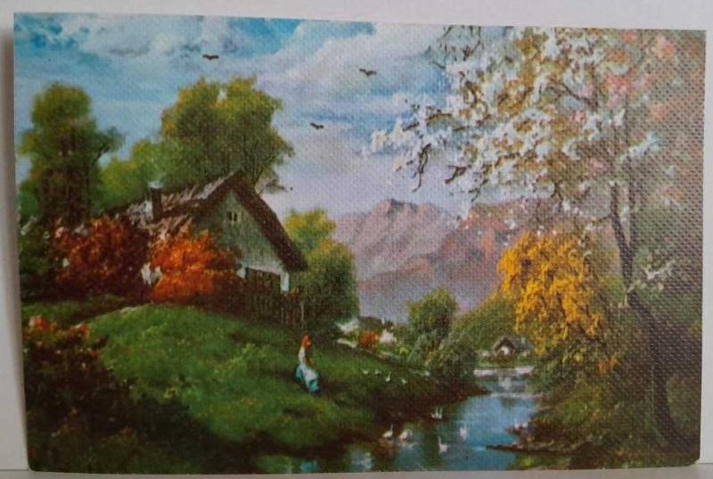 DOĞA İÇİNDE EV ÇİÇEK AÇMIŞ AĞACLAR VE NEHİR RESMİ KARTPOSTALI,ARKASINA YAZILMIŞ,RENKLİ, 11 X 15 CM EBADINDA