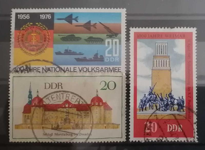 Sol Üstteki Pul (20 DDR): Konu: Ulusal Halk Ordusu'nun (Nationale Volksarmee - NVA) 20. Yılı. 1956-1976 tarihlerini taşır. Üzerinde jet uçakları, tanklar ve savaş gemileriyle topyekûn bir askeri güç gösterisi betimlenmiştir. Soğuk Savaş döneminin askeri atmosferini en iyi yansıtan pullardan biridir. Sol Alttaki Pul (20 DDR): Konu: Schloss Moritzburg bei Dresden (Dresden yakınlarındaki Moritzburg Şatosu). Bu pul, DDR'nin kültürel miras serisinin bir parçasıdır. Mimari zarafetiyle yukarıdaki askeri pulla sert bir tezat oluşturur. Sağdaki Dikey Pul (20 DDR): Konu: Weimar şehrinin 1000. yılı ve Buchenwald Toplama Kampı Anıtı. Pulun sağ kenarında "Buchenwald Toplama Kampı'nın Kendi Kendini Kurtarması - Nisan 1945" ibaresi yer alır.üçünün toplamı yaklaşık 10 TL - 15 TL arasındadır.