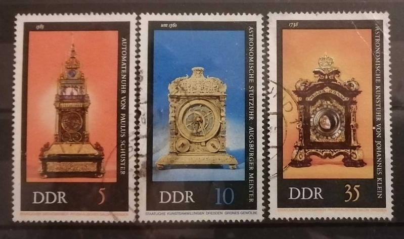 Görseldeki pullar, 1981 yılında Doğu Almanya (DDR) tarafından basılan "Dresden Matematik ve Fizik Salonu'ndan Sanatsal Saatler" (Kunstuhren aus dem Mathematisch-Physikalischen Salon Dresden) serisine aittir. Tekil Değer: Görseldeki damgalı pulların (5, 10 ve 35 Pfennig) her birinin piyasa değeri yaklaşık 0,10 € - 0,25 € arasındadır.