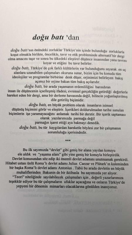 12 sayfada itinalı kısmi kurşun kalem işaretleme,isim yazılı - çok iyi sayfa cildi - yeni gibi İlber Ortaylı, Mehmet Ali Kılıçbay, Etyen Mahçupyan, Hüseyin Hatemi, Coşkun Can Aktan, Mümtaz’er Türköne, Kadir Cangızbay, Durmuş Hocaoğlu, Mehmet Altan, Ahmet İnam, Fehmi Baykan, Nuray Mert, Yasin Ceylan, Ahmet Çiğdem, Mihail Bakunin, Mestrius Plutarkhos, Julius Caesar “doğu batı’nın önündeki zorluklar,Türkiye’nin içinde bulunduğu zorluklarla koşut olmakla birlikte,öncelikle tavır ve etik probleminde alternatif bir dergi olma amacını taşır ve sonra bu ülkedeki eleştirel düşünce insanından yana tavrını koyar ve etiğinini bu tavır belirler. Doğu batı,Türkiye’de çok farklı kültürlerin var bulunduğunu sayarak,en uç alanlara uzanabilen çalışmaları okuruna sunar.Bizim için bu konuda tüm ideolojiler ve programlar birbirine denk düşer,orijinimizi belirleyen bakış açımız bir orijine bakan tüm bakış açılarıdır. Doğu batı birar