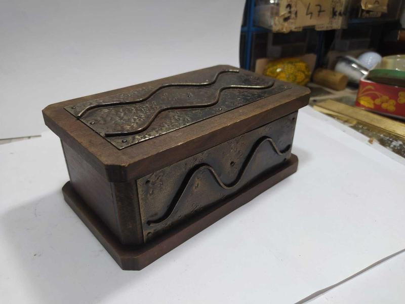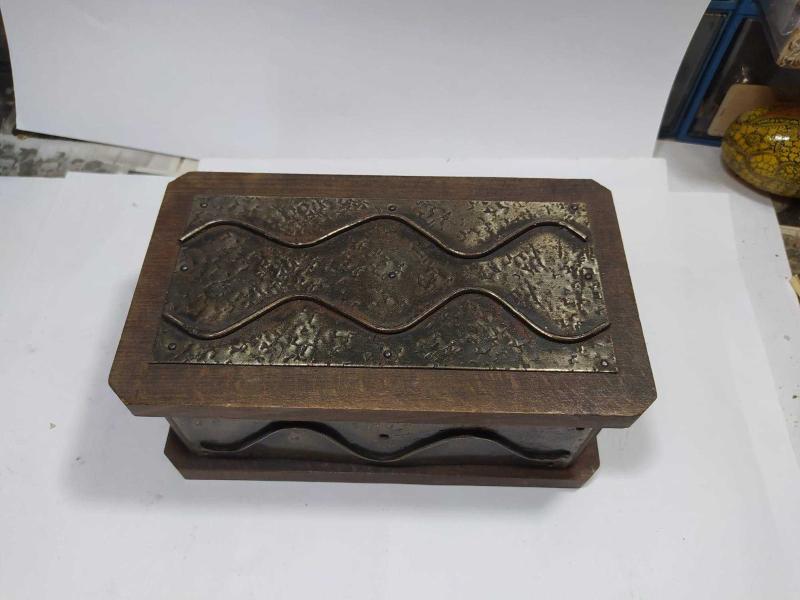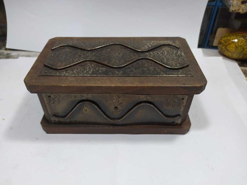 DR1-----METAL DEKORLU AHŞAP KUTU başlıklı antika/koleksiyon objesi Avrupa menşe’lidir. 2000 ve sonrası dönemine aittir.