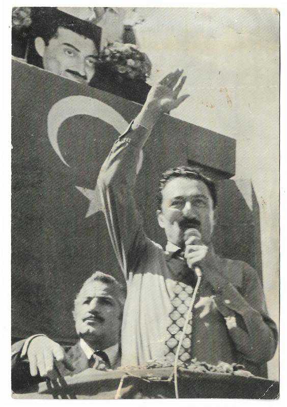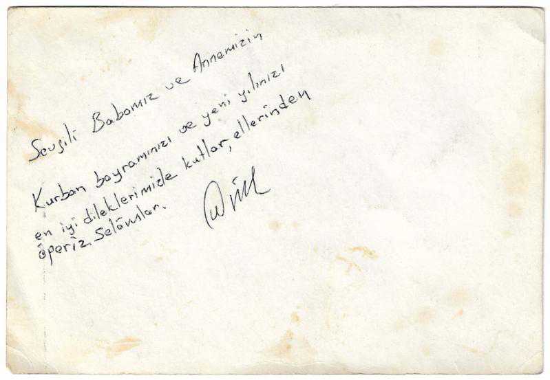 DSP Lideri Bülent Ecevit açık hava mitinginde, arka yüzünde bayram tebrik mesajı yazılı, imzalı.