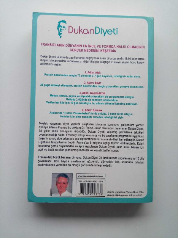 DUKAN DİYETİ (2. EL), DR.PIERRE DUKAN tarafından kaleme alınmıştır. Eser ZEYNEP KUMRULUOĞLU editörlüğünde hazırlanmıştır. Kitap 2011 yılında PEGASUS YAYINLARI tarafından [İSTANBUL] 978-605-4263-73-8 ISBN kodu ile yayınlanmıştır. Satışta olan kitap, yayınevinin 3. baskısıdır. Bu baskının çevirisi ZEYNEP KUMRULUOĞLU tarafından yapılmıştır. 320 sayfadır. Sayfa bilgisi 2.HAMUR olarak belirtilmiştir. DUKAN DİYETİ (2. EL) adlı eser Türkçe dilindedir.