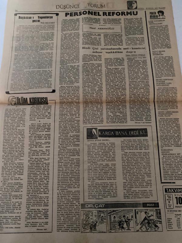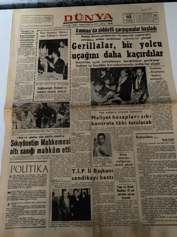 DÜNYA GAZETESİ - DOĞUM GÜNÜ HEDİYESİ (TURKISH NEWSPAPPER) - 10 EYLÜL 1970 - SADECE TEK YAPRAKTIR -Nixon-Denktaş-Munif Akmanoğlu-Osman Güralp-İzmirin kurtuluşu törenlerle kutlandı-İran Dışişleri Bakanı dan Tahrana döndü-Ammanda şiddetli çarpışmalar başladı-Gerillalar bir yolcu uçağını daha kaçırdılar-Kaçırılan uçak yolcularının bırakılması gecikiyor Ankarada Yeşilköy havaalanlarında tedbirler alındı-Çağlayangil Kanadayı resmen ziyaret edecek-Maliyet hesapları sıkı kontrole tabi tutulacak-Sıkıyönetim Mahkemesi altı sanığı mahkûm etti-T İ P İl Başkanı sendikayı bastı-POLİTİKA-Alman uzmanlar trafiğimize çare bulacak-Yapı ve Kredi Bankası 21 inci çalışma yılına başladı-Karşılıklı-Başbakanın Yugoslavya gezisi-Personel reformu-Hindi Çin yarımadasında anti komünist mihver teşekkülüne doğru-Pratik bilgiler-Karga bana dedi ki-Ölüm korkusu-Takvim adlı eser Türkçe dilindedir.