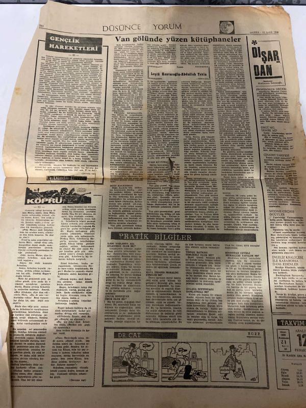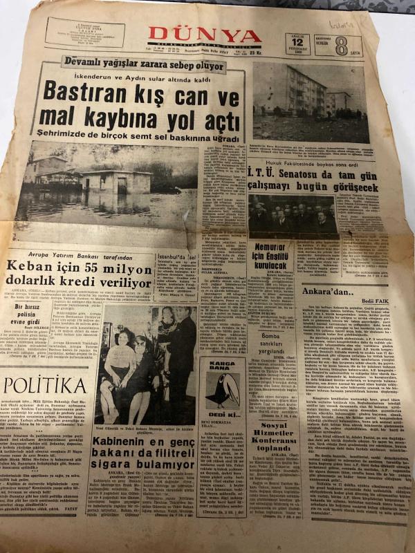 DÜNYA GAZETESİ - DOĞUM GÜNÜ HEDİYESİ (TURKISH NEWSPAPPER) - 12 ARALIK 1968 - SADECE TEK YAPRAKTIR -Falih Rıfkı Atay-Bedi Faik-Leyla Kantaroğlu-Abdullah Tekin-Bastıran kış can ve mal kaybına yol açtı-Devamlı yağışlar zarara sebep oluyor-İskenderun ve Aydın sular altında kaldı-Şehrimizde de birçok semt sel baskınına uğradı-İ T Ü Senatosu da tam gün çalışmayı bugün görüşecek-Hukuk Fakültesinde boykot sona erdi-Memurlar için Enstitü kurulacak-Keban için 55 milyon dolarlık kredi veriliyor-Avrupa Yatırım Bankası tarafından-Polis Şişli Öğrenci Yurdunu dün aradı-Üç molotof kokteyli ve yasak yayınlar ele geçti-Kabinenin en genç bakanı da filtreli sigara bulamıyor-Sosyal Hizmetler Konferansı-Ankara’dan-Van gölünde yüzen kütüphaneler-Gençlik Hareketleri-Dışardan-Pratik Bilgiler-Düşünce Yorum-Takvim adlı eser Türkçe dilindedir.