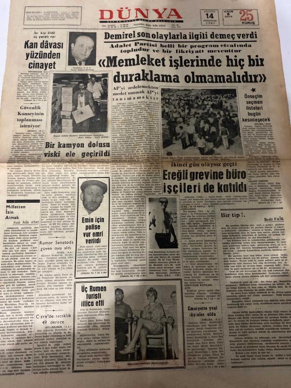 DÜNYA GAZETESİ - DOĞUM GÜNÜ HEDİYESİ (TURKISH NEWSPAPPER) - 14 AĞUSTOS 1969 - SADECE TEK YAPRAKTIR -Demirel-Falih Rıfkı Atay-Bedii Faik-Reşit Akif Atasoy-Münif Akmanoğlu-Muharrem Atlıkan-El Lacy-Demirel son olaylarla ilgili demeç verdi-Memleket işlerinde hiç bir duraklama olmamalıdır-Kan davası yüzünden cinayet-Güvenlik Konseyinin toplanması isteniyor-Bir kamyon dolusu viski ele geçirildi-İkinci gün olaysız geçti-Ereğli grevine büro işçileri de katıldı-Önseçim seçmen listeleri bugün kesinleşecek-Emniyet için polise vur emri verildi-Üç Rumen turisti iltica etti-Emniyette yeni tayinler-Dünyada nüfus artışı tehlikesi-Dışardan-Ucuz prenses-Uçan prenses-Genç aşk-Başkan karısı değil olmak kolay değil-Mesut film-Pratik bilgiler domatesli omlet nasıl yapılır-Enzim neden çabuk çalışır-Bilgisiz eczacı kullanır mıyız-Dr Çat-Bozz-Takvim adlı eser Türkçe dilindedir.