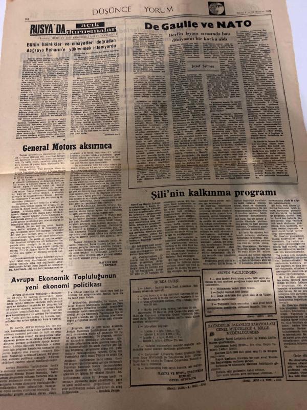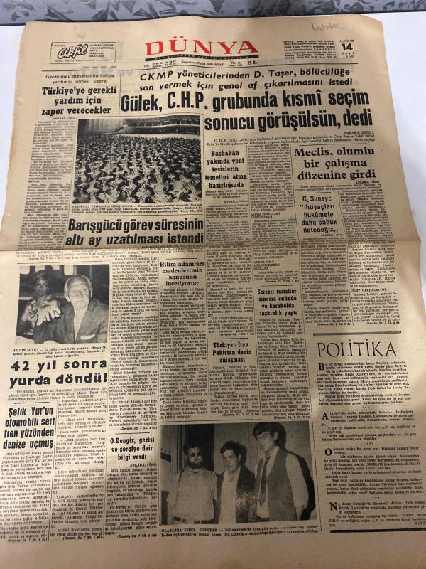 DÜNYA GAZETESİ - DOĞUM GÜNÜ HEDİYESİ (TURKISH NEWSPAPPER) - 14 HAZİRAN 1966 - SADECE TEK YAPRAKTIR -Süleyman Demirel-Nihat Erim-Cevdet Sunay-Bedi Faik-Mehmet Arif Demirer-Miray Tekelioğlu-Jozef Salinas-Maurice Roy-Fatih Rıfkı Atay-Gülek CHP grubunda kısmi seçim sonucu görüşülsün dedi-Meclis olumlu bir çalışma düzenine girdi-Barış gücü görev süresinin altı ay uzatılması istendi-42 yıl sonra yurda döndü-Şefik Yur’un otomobili sert fren yüzünden denize uçmuş-Türkiyeye gerekli yardım için rapor verecekler-Sunav yargı organlarını ziyaret etti-Serenli turistlere sinema önünde ve karakolda taşkınlık yaptı-Rusyada açık duruşmalar-De Gaulle ve NATO-General Motors aşırı kazanınca-Avrupa Ekonomik Topluluğunun yeni ekonomi politikası-Şilinin kalkınma programı-Politika adlı eser, Kitap > Süreli Yayınlar > Gazeteler > Türkiye > Genel > Günlük kategorisinde İkinci El olarak satıştadır.