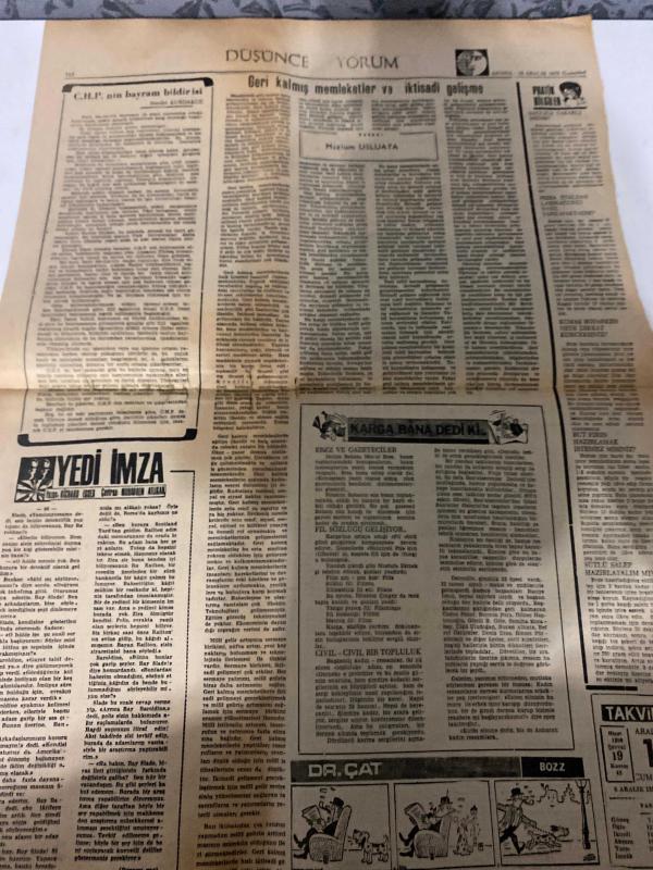 DÜNYA GAZETESİ - DOĞUM GÜNÜ HEDİYESİ (TURKISH NEWSPAPPER) - 19 ARALIK 1970 - SADECE TEK YAPRAKTIR -Süleyman Demirel-Cevdet Sunay-Mehmet Felek-Bedii Faik-Hikmet Usluata-Yabancı gazetecilerin haber vermesi önleniyor-Polonyada ayaklanmalar diğer şehirlere yayılıyor-Çatışmalarda çok sayıda ölü ve yaralı var işçi ve öğrencilerden sonra ev kadınları da ayaklandı-Karma Komisyon Bütçe Tasarısını görüşüyor-Bedelsiz otomobil ithali için yeni kararname çıktı-Dağ fare doğurdu-Demokratik Parti kurucuları arasında 26ların hepsi yok-Üniversiteye giremiyen lise mezunları dün de olaylara sebep oldu-Kaçan tutuklu Nazım Felek-Sağmalcılar Cezaevinden 2 mahkum kaçtı-Kar uçak seferlerini aksattı-Bir kasap görevli polisi bıçaklayarak öldürdü-Katil Dimitri linçten zor kurtuldu-Turist pasaportu ile hacca gidenler var-Politika-Geri kalmış memleketler ve iktisadi gelişme-CHP nin bayram bildirisi-Yedi İmza-Karga bana dedi ki-Pratik bilgiler-Sütlü salep hazırlayalım mı-Et nasıl kızartılır-Civil civil bir topluluk- adlı eser Türkçe dilindedir.