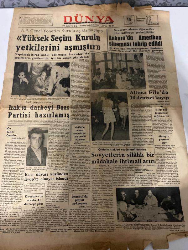 DÜNYA GAZETESİ - DOĞUM GÜNÜ HEDİYESİ (TURKISH NEWSPAPPER) - 19 TEMMUZ 1968 - SADECE TEK YAPRAKTIR -Falih Rıfkı Atay-Numan Özdemir-Mazlum Usluata-Yüksek Seçim Kurulu yetkilerini aşmıştır-Ankara’da Amerikan sineması tahrip edildi-Altıncı Filo’da 16 denizci kayıp-Irak’ta darbeyi Baas Partisi hazırlamış-Emekli, dul ve yetimlerin maaşları yükseltilecek-Kan davası yüzünden Eyüp’te cinayet işlendi-Diyarbakır’da sıcaklık 43 dereceye çıktı-İstanbul’da plajlar mikropsuz-Sovyetlerin silahlı bir müdahale ihtimali arttı-Çeklerin istekleri reddetmesi üzerine-Düşünce Yorum-Demokratik memleketlerde plânlama-Cide’nin kaderi-Öldüren kadın-Pratik bilgiler-Dışardan-Dr Cat adlı eser Türkçe dilindedir.