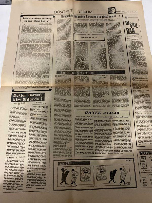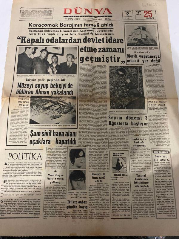 DÜNYA GAZETESİ - DOĞUM GÜNÜ HEDİYESİ (TURKISH NEWSPAPPER) - 2 AĞUSTOS 1969 - SADECE TEK YAPRAKTIR -Süleyman Demirel-Burhanettin S Mı-Ed Lacy-Muharrem Altıkan-Nusret Özdemir-Karaçomak Barajının temeli atıldı-Kapalı odalardan devlet idare etme zamanı geçmiştir-Müzeyi soyup bekçiyi de öldüren Alman yakalandı-İkiyüz polis peşinde idi-Şam sivil hava alanı uçaklara kapatıldı-Merihe göre Merih yaşamaya müsait yer değil-Seçim dönemi 3 Ağustosta başlıyor-İşgalci işçiler hakkında dava açıldı-İki kız onbeş gündür kayıp-İhracatçı 30 firma tatil edildi-Tasarruf bonolarının değiştirilmesine dün başlandı-Bir Damla Sabır taşı bile çatlar-Tatilde çocukların okuyacağı bir eser Çocuk Kaldi-Ekonominin dinamizmi karşısında bugünkü adalet-Doktor Barnes i kim öldürdü-Pratik Bilgiler-Örnek Analar-Dışardan-Düşünce Yorum-Takvim adlı eser Türkçe dilindedir.