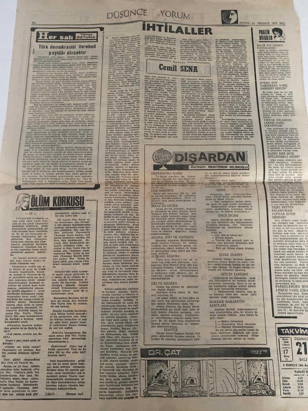 DÜNYA GAZETESİ - DOĞUM GÜNÜ HEDİYESİ (TURKISH NEWSPAPPER) - 21 TEMMUZ 1970 - SADECE TEK YAPRAKTIR -Süleyman Demirel-Bülent Ecevit-M Emin AYTEKİN-Dr B HAYİT-Muhterem SELİMOĞLU-Cemil SENA-Ortak Pazar hazırlık dönemi son safhaya geldi-Çağlayangil Brüksel e gitti-Sıkı yönetimde dün iki davaya bakıldı-Öğrenciler Yıldız da imtihanlara girdiler-İran petrolleri için bir boru fabrikası kurulacak-Ecevitizm-Politika-İhtilaller-Her salı Yılmaz ÖZTUNA-Türk demokrasisi ilelebed payidar olacaktır-Dışardan-Ölüm korkusu-Pratik bilgiler-Takvim adlı eser Türkçe dilindedir.