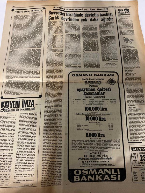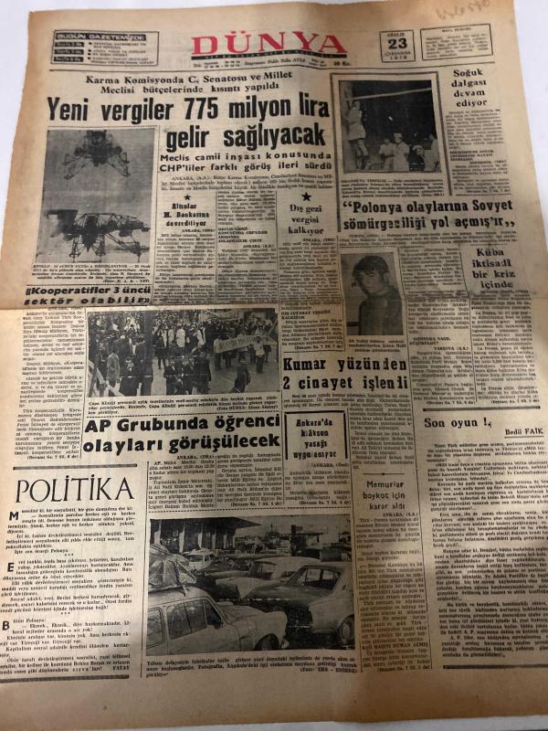 DÜNYA GAZETESİ - DOĞUM GÜNÜ HEDİYESİ (TURKISH NEWSPAPPER) - 23 ARALIK 1970 - SADECE TEK YAPRAKTIR -Bedii Faik-Yeni vergiler 775 milyon lira gelir sağlayacak-Karma Komisyonda C Senatosu ve Millet Meclisi bütçelerinde kısıntı yapıldı-Meclis camii inşası konusunda CHP liler farklı görüş ileri sürdü-Polonya olaylarına Sovyet sömürgeciliği yol açmıştır-Küba iktisadı bir kriz içinde-Kooperatifler 3 üncü sektör olabilir-AP Grubunda öğrenci olayları görüşülecek-Kumar yüzünden 2 cinayet işlendi-Ankarada rikson yasası uygulanıyor-Memurlar boykot için karar aldı-Son oyun-Politika-Soğuk dalgası devam ediyor-Sovyetler Birliğinde devletin baskısı Çarlık devrinden çok daha ağırdır-Atatürk devrimleri ve Rus ihtilali-Japonya tekrar silahlanıyor-Yedi İmza-Karga bana dedi ki-Pratik bilgiler-Bulaşıklar nasıl yıkanmalı-Koku almayan insan var mıdır-Hafızlık düşünce kabiliyeti azaltır mı-Omurilik iltihabı neden ileri gelir-Osmanlı Bankası apartman dairesi kazananlar-Dr Cat-Bozz adlı eser Türkçe dilindedir.