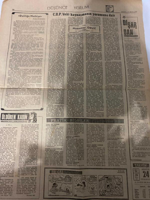 DÜNYA GAZETESİ - DOĞUM GÜNÜ HEDİYESİ (TURKISH NEWSPAPPER) - 24 AĞUSTOS 1968 - SADECE TEK YAPRAKTIR -Nedret KURDAKUL-Muammer OBUZ-Bedii FAİK-Süleyman Demirel-Şükran Çiğdem-Svoboda Moskova’ya gitti-Prag’da şiddetli sokak çarpışması oluyor-Rus askerleri ve nefretle bakan Çek’ler-İşgalci bir Rus askeri utancından intihar etti-Oğlum nerede-Dubçek’in nerede olduğunu bilen yok-Yeni oyuna doğru-Rus saldırısı protesto edildi-Niçin-POLİTİKA-Dış dünya ile temas Türkiye elçiliğinden yapılıyor-Güvenlik Konseyinde-Demirel, Mardin’de yeni tesisler açtı-Açılan her kuyu, çekilen çileye paydos demektir-DÜŞÜNCE YORUM-Deliliğe Methiye-C.H.P.’deki kaynaşmanın yorumuna dair-DIŞARDAN-BALIKLARA GECEKONDU-DEV SOMKÜLÖBCEK-PRAKTİK BİLGİLER-Korse ile yatmak doğru mudur-Yılan ısırınca yapılacak ilk yardım-Kızıl akrep sokması-Limon likörü yapmak-Yüzünüz maske nasıl yapılır-TAKVİM-Öldüren Kadın adlı eser Türkçe dilindedir.