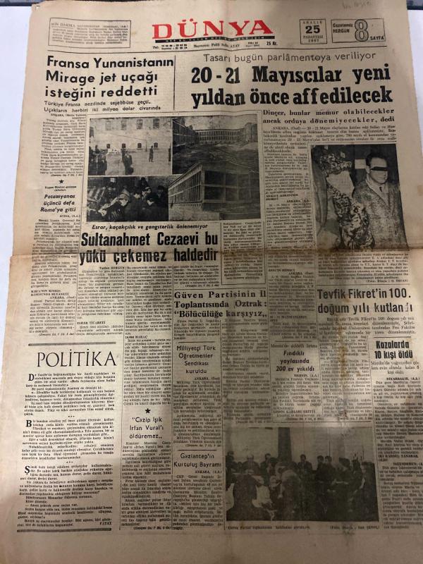 DÜNYA GAZETESİ - DOĞUM GÜNÜ HEDİYESİ (TURKISH NEWSPAPPER) - 25 ARALIK 1967 - SADECE TEK YAPRAKTIR -Tevfik Fikret-U Thant-Manescu-İrfan Vural-Hikmet Törk-Ali Soycan-Ali Rıza Atay-Fatih Rıfkı Atay-Charles de Gaulle-Aristotle Onassis-Dr Aki Kanso-Antoine-Hayatı sevmek-Fransa Yunanistanın Mirage jet uçağı isteğini reddetti-20 21 Mayıscılar yeni yıldan önce affedilecek-Sultanahmet Cezaevi bu yükü çekemez haldedir-Güven Partisinin il toplantısında Oztrak Bölücülüğe karşıyız-Tevfik Fikretin 100 doğum yılı kutlandı-Politika-Meksika buğdayı ve tarım ilaçları-Seni seveceğim-Düşünce Yorum-Dışardan adlı eser Türkçe dilindedir.