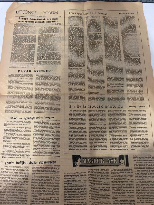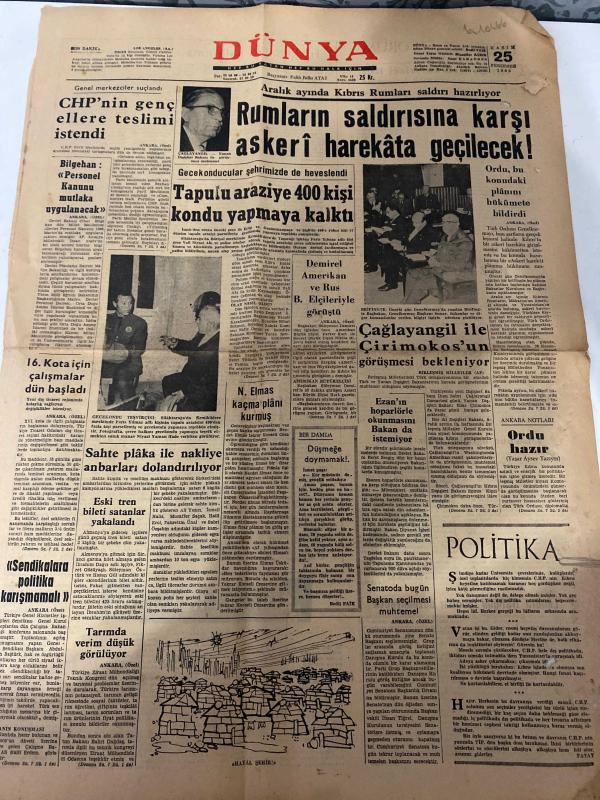 DÜNYA GAZETESİ - DOĞUM GÜNÜ HEDİYESİ (TURKISH NEWSPAPPER) - 25 KASIM 1965 - SADECE TEK YAPRAKTIR -Çağlayangil-Demirel-N. Elmas-Necdet Kurdakul-Stanley Karnow-Ayhan Turan-Candide-Rumların saldırısına karşı askerî harekâta geçilecek-Aralık ayında Kıbrıs Rumları saldırı hazırlıyor-Tapulu araziye 400 kişi kondu yapmaya kalktı-Çağlayangil ile Çirimokos’un görüşmesi bekleniyor-Demirel Amerikan ve Rus Elçileriyle görüştü-Sahte plaka ile nakliyat yapanlar dolandırıcılık-Sendikalara politika karışmıyor-Tarımda verim düşük görülüyor-Avrupa Komünistleri Batı Almanyasını çekmek istiyorlar-Türkiye’nin kalkınması-Pazar Konseri-Mao’nun uğradığı sekiz bozgun-Bin Bella çabucak unutuldu-Londra trafiğini robotlar düzenleyecek-Mağrur Aşk adlı eser Türkçe dilindedir.