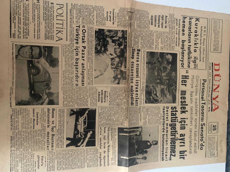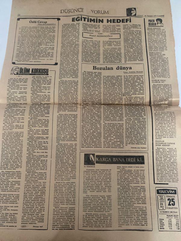 DÜNYA GAZETESİ - DOĞUM GÜNÜ HEDİYESİ (TURKISH NEWSPAPPER) - 25 TEMMUZ 1970 - SADECE TEK YAPRAKTIR -Münif AKKANOĞLU-Muhittin YILMAZ-DÜNYA-POLİTİKA-Kuraklıkla ilgili kararların tatbikine hemen başlanıyor-Personel Tasarısı Senato’da-Statü getirilemez her meslek için ayrı bir-Ortak Pazar anlaşması Türkiye için başarıdır-Bursa Cezaevi isyancıları Sinop cezaevine nakledildi-Eğitimin Hedefi-Bozulan dünya-Ölüm korkusu-Özlü Cevap-Karga bana dedi ki-Pratik bilgiler-Takvim adlı eser Türkçe dilindedir.