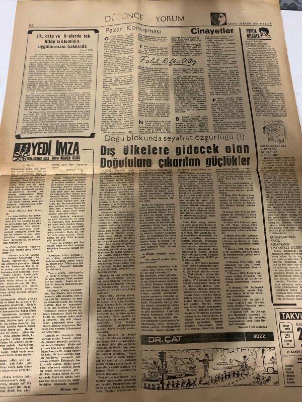 DÜNYA GAZETESİ - DOĞUM GÜNÜ HEDİYESİ (TURKISH NEWSPAPPER) - 29 KASIM 1970 - SADECE TEK YAPRAKTIR -Demirel-İnönü-Bediî FAİK-Falih Rıfkı Atay-Sadi Tan-Demirel Yenisi en kısa zamanda hizmete girecek-İnönü Eli silahlı öğrenci Atatürk’ün varisi olamaz-Memurlara bayramdan önce avans verilecek-Ankara Ticari İlimler de boykota gitti-Dünya Bankası Sınai Kalkınmaya 40 milyon dolarlık kredi verdi-Kanada ekmeklik buğday veriyor-Yangın-Demirel Gediz’e gidiyor-Olaylar ve insanlar-Pazar Konuşması-Cinayetler-İlk orta ve liselerde tek kitap sisteminin uygulanması hakkında-Yedi imza-Dış ülkelere gidecek olan Doğululara çıkarılan güçlükler-Pratik bilgiler-Takvim adlı eser Türkçe dilindedir.