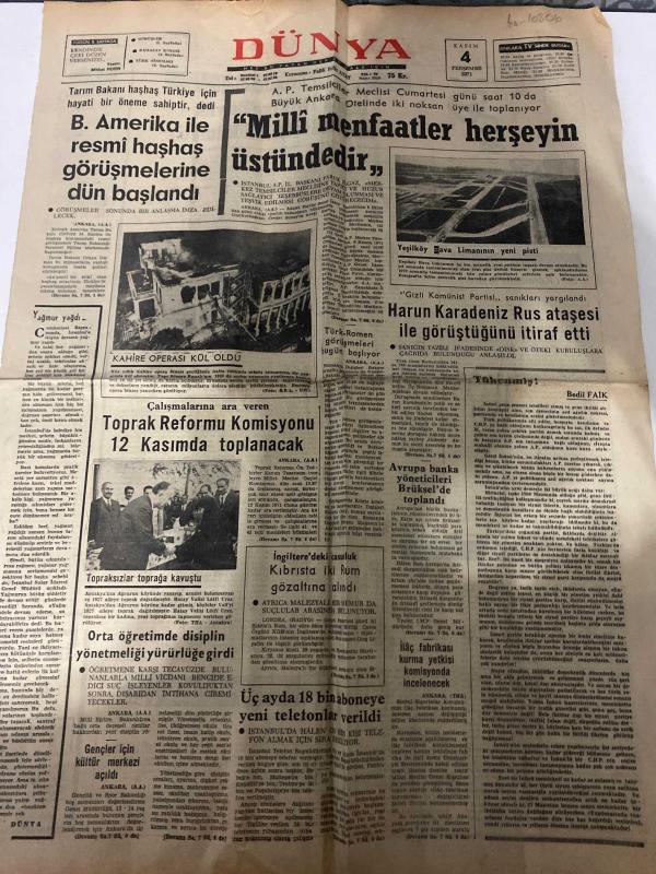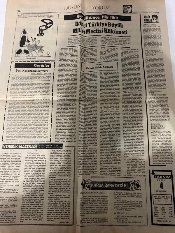 DÜNYA GAZETESİ - DOĞUM GÜNÜ HEDİYESİ (TURKISH NEWSPAPPER) - 4 KASIM 1971 - SADECE TEK YAPRAKTIR -Falih Rıfkı Atay-Harun Karadeniz-Bedii Faik-Kemal Şahir Sunar-Millî menfaatler herşeyin üstündedir-B. Amerika ile resmî haşhaş görüşmelerine dün başlandı-TRT Yönetim Kurulunda da İpekçi’nin tutumu kınandı-İçki ve sigara zamları açıklandı-Kahire Operası kül oldu-Toprak Reformu Komisyonu 12 Kasımda toplanacak-Harun Karadeniz Rus ataşesi ile görüştüğünü itiraf etti-Avrupa banka yöneticileri Brüksel’de toplandı-İngiltere’deki asıllı Kıbrıslı iki Rum gözaltına alındı-İlaç fabrikası kurma yetkisi komisyonda incelenecek-Üç ayda 18 bin aboneye yeni telefonlar verildi-Orta öğretimde disiplin yönetmeliği yürürlüğe girdi-Gençler için kültür merkezi açıldı-İkinci Türkiye Büyük Millet Meclisi Hükümeti-Hür düşünce Hür fikir-Görüşler-Batı Karadeniz kıyıları-Venedik macerası-Pratik bilgiler-Dekolte giyim hoş karşılanır mı-Boşanmış eşlerin çocukları hayatta başarısız mı olurlar-Ağız sağlığına önem veriyor m adlı eser Türkçe dilindedir.