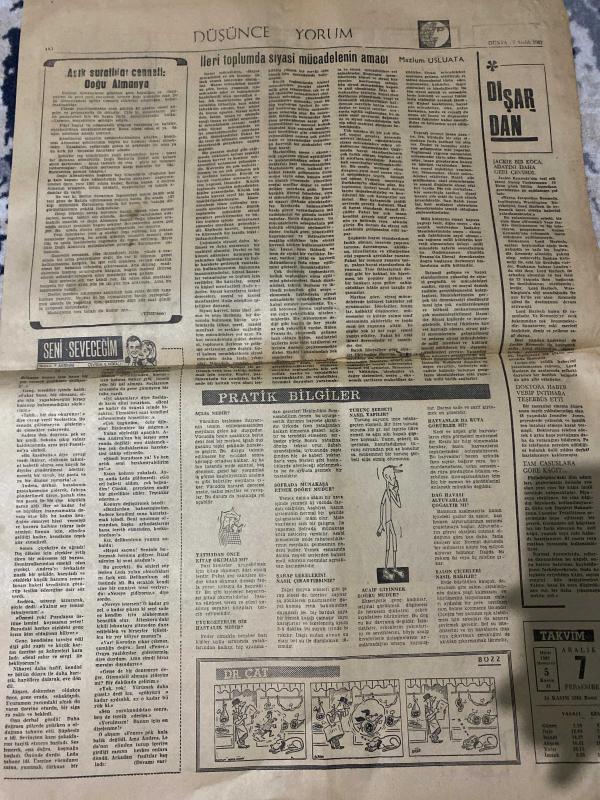 DÜNYA GAZETESİ - DOĞUM GÜNÜ HEDİYESİ (TURKISH NEWSPAPPER) - 7 ARALIK 1967 - SADECE TEK YAPRAKTIR -Johnson-Cemal Tural-Fahri Rıfkı Atay-Bedii Faik-Erdoğan Bazer-M. Emin Aytekin-Mazlum Usluata-Ingrid Bergman-Turan Tuluy-Pipinelis-Kıbrıstaki Yunan askerleri yarın çekilmeye başlıyor-Başkan Johnson tarafları tebrik etti-NATO Bakanlar Konseyi gelecek hafta içinde toplanıyor-Or Gnl Cemal Tural Trakyada-Güven Partisi üç ilde ve Trabzonda seçim kazandı-Alâkımız kalkınma duruma bağlıdır-CHP Kıbrıs konusunda açıklama yapacak-Kaatil Almanın nişanlısı bulundu-Biri kızını diğeride karısını satmış-Sonun başlangıcı-İleri toplumda siyasi mücadelenin amacı-Dışardan-Pratik bilgiler-Rosa-Seni seveceğim adlı eser, Kitap > Süreli Yayınlar > Gazeteler > Türkiye > Genel > Günlük kategorisinde İkinci El olarak satıştadır.