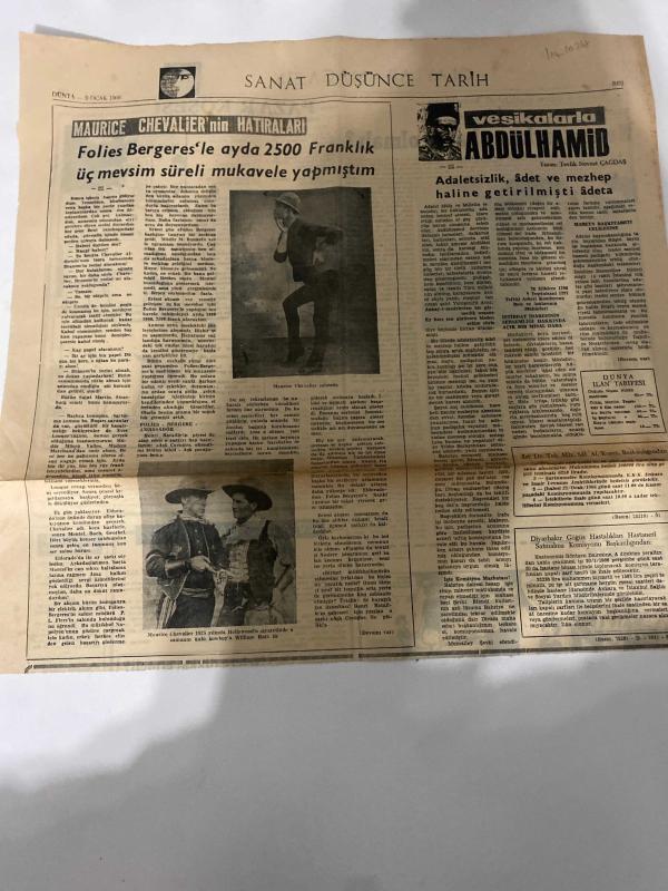 DÜNYA GAZETESİ - DOĞUM GÜNÜ HEDİYESİ (TURKISH NEWSPAPPER) - 9 OCAK 1966 - SADECE TEK YAPRAKTIR -Maurice Chevalier-William Hart-Tevfik Nevzat Çağdaş-Darrel McClure-Melahat Aybar-Maurice Chevalierin hatıraları-Folies Bergeresle ayda 2500 Franklık üç mevsim süreli mukavele yapmıştım-Vesikalarla Abdülhamid-Adaletsizlik adet ve mezhep haline getirilmişti adeta-Normal uyku ne kadar-Fareler üzerinde doğum kontrolu ile ilgili bir deney yapılıyor-Pazar köşesi-Eller yukarı-Eviniz ve sağlığınız Romatizma-Yıldızınız ne diyor adlı eser Türkçe dilindedir.