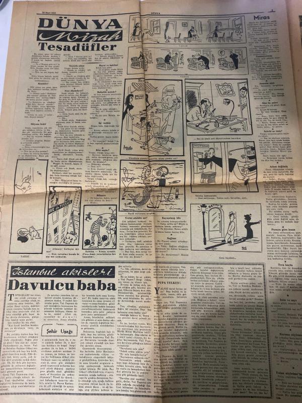 DÜNYA GAZETESİ PAZAR İLAVESİ DOĞUM GÜNÜ HEDİYESİ- 22 MART 1953 - TURKİSH NEWSPAPER -Anna Magnani-Susan Hayward-Mitzi Gaynor-Danny Kaye-Zeki Müren-Safiye Ayla-Horoz Hardi-Amet Hüsnü-Ester Williams-Jane Russell-J. Mason-Turhan Aker-Şehir Uşağı-Angèle Augier-Auguste-Vathek-Rauf Sezer-Franz Lukaszek-Feridun Lafaslı-TÜRKİYE(1)-YUNANİSTAN(0)-Altın Fayon filminde-Anna Magnani Şeker kız adı ile anılan Mitzi Gaynor-Evdeğiştirme uğurlumudur-Yıldızlar ansiklopedisi-60 yaşında dans hocası-Kadın Moda-Bahar ve yaz modasını hususiyetleriyle izah eden 35 model-Haftalık radyo programları-Dünya Mizah Tesadüfler-Miras-İstanbul akisleri Davulcu baba-Müşteri önünde emirle yumurtlayan tavuklar-Öldürten hastalık-Dünyanın en güzel çiçekleri nerededir?-Topuk feneri-Avrupada yeni bir havacılık sahası açılıyor-Dünya Spor-Türkiye Yunanistan karşılaşması-Beşiktaş Galatasaray bugün karşılaşıyor adlı eser Türkçe dilindedir. Eserin içeriğinde Türkçe dilinde bölümlere de yer verilmektedir.