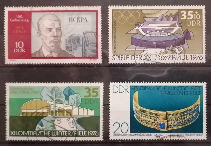 Pulların Kimlikleri Sol Üst: W.I. Lenin'in 100. Doğum Günü (1970). Üzerinde Lenin ve "Iskra" gazetesi basım makinesi tasviri yer alıyor. Sağ Üst: 1976 Montreal Yaz Olimpiyatları serisinden Suhl atıcılık poligonu. (35+10 Pfennig sürşarjlı). Sol Alt: 1976 Innsbruck Kış Olimpiyatları serisinden Karl-Marx-Stadt (bugünkü Chemnitz) buz pisti. Sağ Alt: DDR Müzelerindeki Antik Afrika Sanat Hazineleri serisinden bir Mısır bileziği (1975).