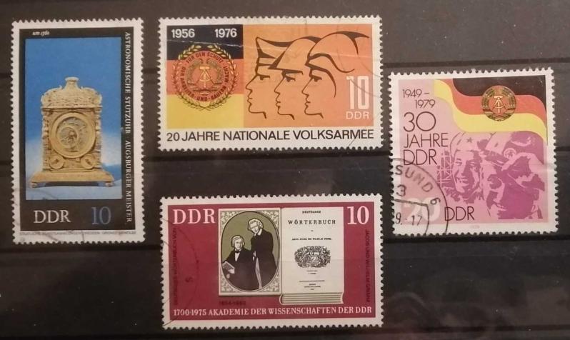 Sol Üst (10 Pf) Dresden "Yeşil Tonoz" Hazineleri 1971 Augsburg ustaları tarafından yapılmış Astronomik Masa Saati (Astronomische Stutzuhr). Üst Orta (10 Pf) Ulusal Halk Ordusu'nun (NVA) 20. Yılı 1976 "İşçi ve Köylü Gücünü Korumak İçin" ibaresiyle, üç farklı askeri birliğin profilini gösteren propaganda pulu. Alt Orta (10 Pf) DDR Bilimler Akademisi'nin 275. Yılı 1975 Dilbilimci Grimm Kardeşler (Jacob & Wilhelm) ve meşhur Alman Sözlüğü (Deutsches Wörterbuch) çalışması. Sağdaki (20 Pf) DDR'nin 30. Kuruluş Yıldönümü 1979 1949-1979 dönemini kutlayan, üzerinde DDR bayrağı, amblemi ve mutlu halk figürleri olan yıl dönümü pulu.