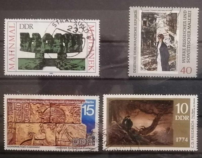 Sol Üst: Majdanek Anıtı (Mahnmal Majdanek - 1980). Polonya'daki eski toplama kampı Majdanek'te kurbanların anısına dikilen devasa anıtı tasvir eder. DDR'nin antifaşist duruşunu simgeleyen, ağırbaşlı ve tarihi bir puldur. Üzerindeki Stralsund damgası oldukça nettir. Sağ Üst (40 Pf): Rus ve Sovyet Resim Sanatı Serisi (1972). Moskova'daki Yeni Ustalar galerisinden L.W. Kabatschek'in bir eserini ("Genç Kadın" veya benzeri bir portre) gösterir. DDR'nin Sovyetler Birliği ile olan sanatsal bağını vurgulayan dikey formda bir puldur. Sol Alt (15 Pf): Berlin Humboldt Üniversitesi Arkeolojik Araştırmaları. Sudan'daki Musawwarat es-Sufra kazılarını konu alır. Görselde Aslan Tapınağı'ndan Kral Arnekhamani'nin başı yer alıyor. DDR'nin Afrika'daki arkeolojik çalışmalarını belgeleyen önemli bir seridir. Sağ Alt (10 Pf): Caspar David Friedrich (1974). Ressamın 200. doğum yılı serisinden ikonik bir eser: "Ayı Seyreden İki Adam" (Zwei Männer in Betrachtung des Mondes). Friedrich'in en meşhur tablolarından biridir.
