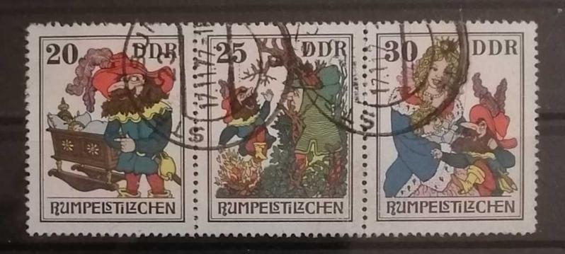 Rumpelstilzchen Serisi (Devamı) 20 Pf (Sol): Cücenin kraliçeye bebeği almak için şart koştuğu sahne. 25 Pf (Orta): Masalın dönüm noktası; kraliçenin bir hizmetkarı ormanda cücenin ateş etrafında dans ederken kendi ismini ("Rumpelstilzchen") söylediğini gizlice duyar. 30 Pf (Sağ): Final sahnesi. Kraliçe cücenin adını doğru tahmin eder; cüce öfkesinden yere öyle sert vurur ki kendi kendini ikiye böler (veya bazı versiyonlarda ortadan kaybolur).