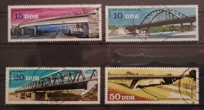 Köprüler Serisi (1976) Bu seri, o dönemin sosyalist mimari anlayışını ve teknik başarısını sergiler. Pullar üzerindeki detaylar şöyledir: 10 Pf (Sağ Üst): Templiner Gölü üzerindeki köprü (Potsdam yakınları). 15 Pf (Sol Üst): Berlin-Adlersgestell üzerindeki üst geçit/köprü yapısı. 20 Pf (Sol Alt): Rosslau yakınlarındaki Elbe Köprüsü. 50 Pf (Sağ Alt): Schwerin'deki "Grosser Dreesch" bölgesinde bulunan modern bir köprü yapısı.